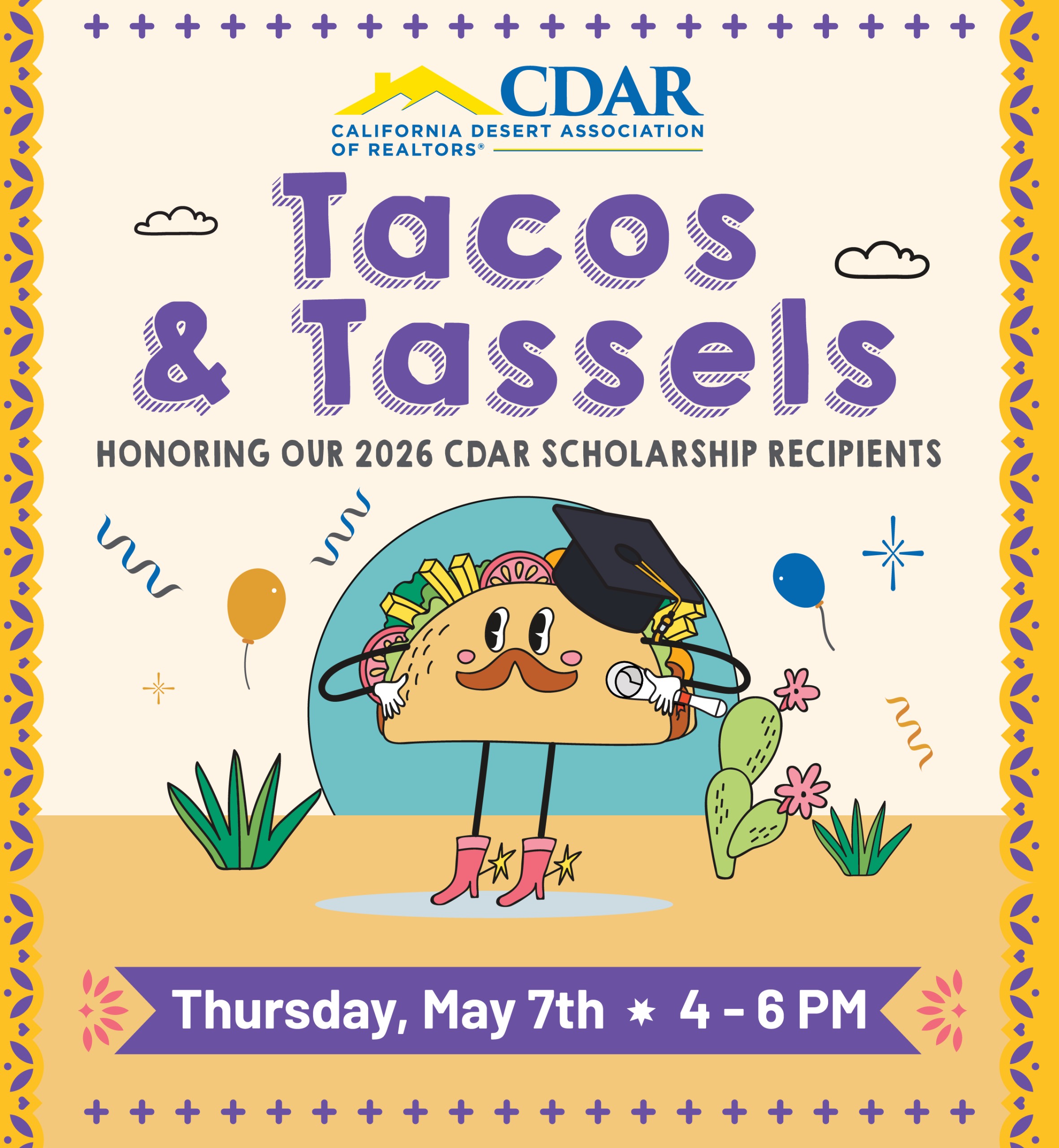 Celebrate the next generation with us at Tacos & Tassels, a meaningful afternoon of connection, community, and celebration! Join us on Thursday, May 7th, from 4 – 6 PM at the CDAR Office (44475 Monterey Ave, Palm Desert, CA, 92260) as we honor this year’s CDAR Scholarship recipients. This special event will take the place of our May Monthly Mixer, bringing together members, scholarship recipients, and their families for a heartfelt gathering. Enjoy free delicious tacos and refreshing raspados by Desert Fire Tacos n Bar, connect with fellow members, and help us recognize and celebrate the achievements of these inspiring students. Thank you to our sponsor, Kevin Budde with Monarch Coast Financial.