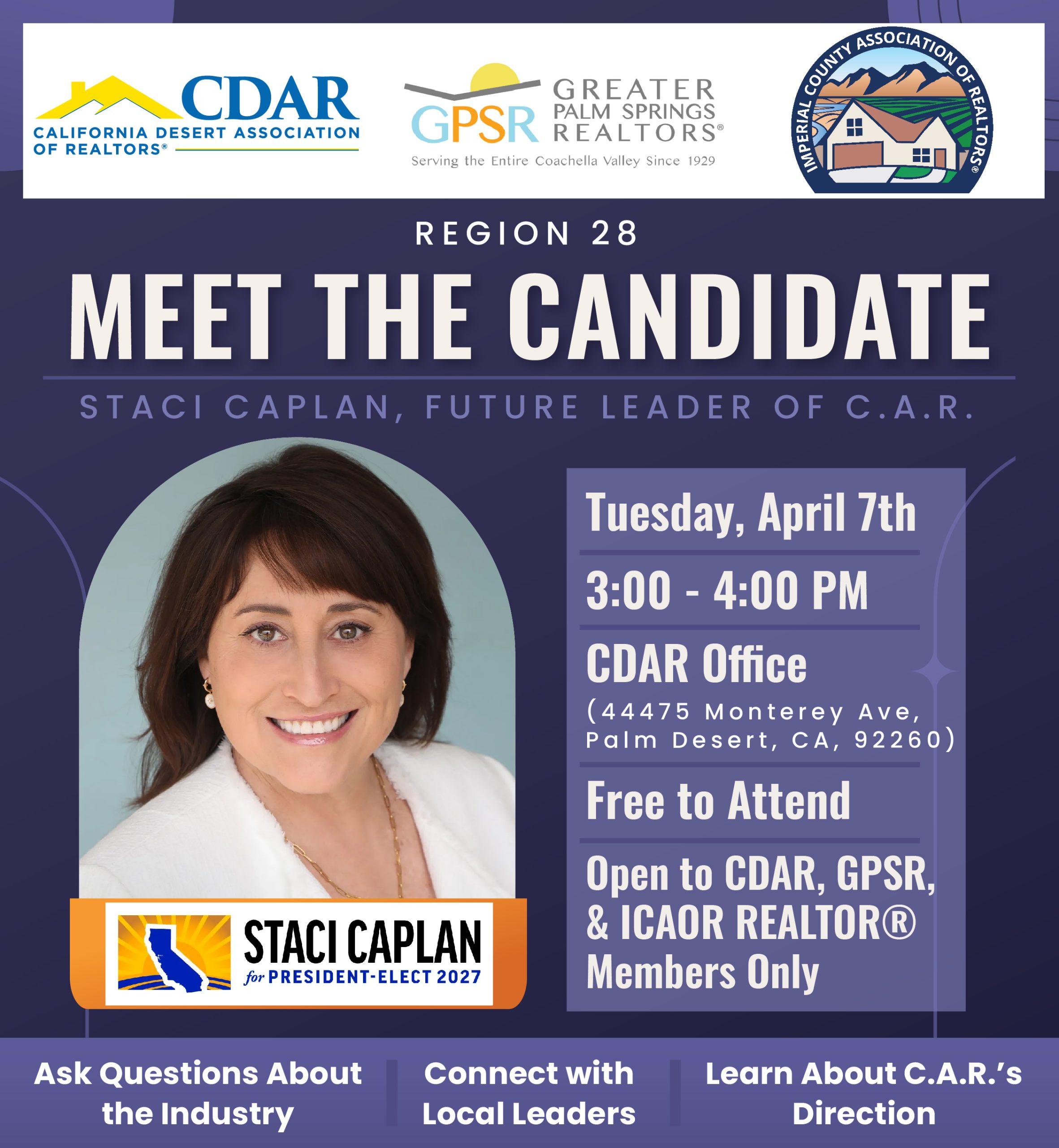 Join us for an opportunity to meet Staci Caplan, candidate for 2027 President-Elect of the California Association of REALTORS® and future leader of C.A.R.